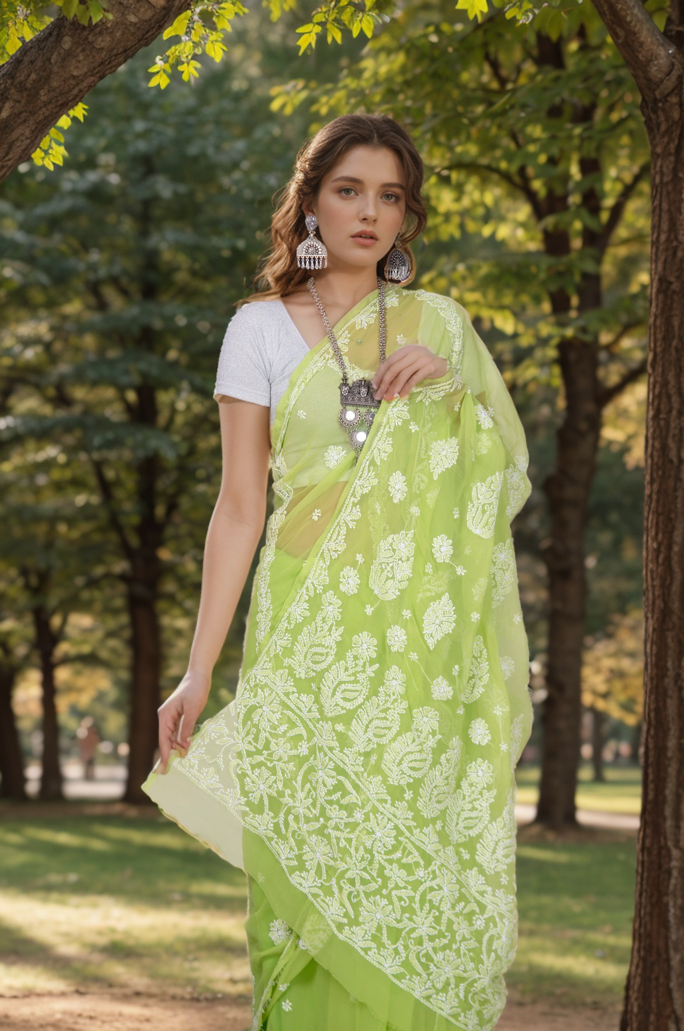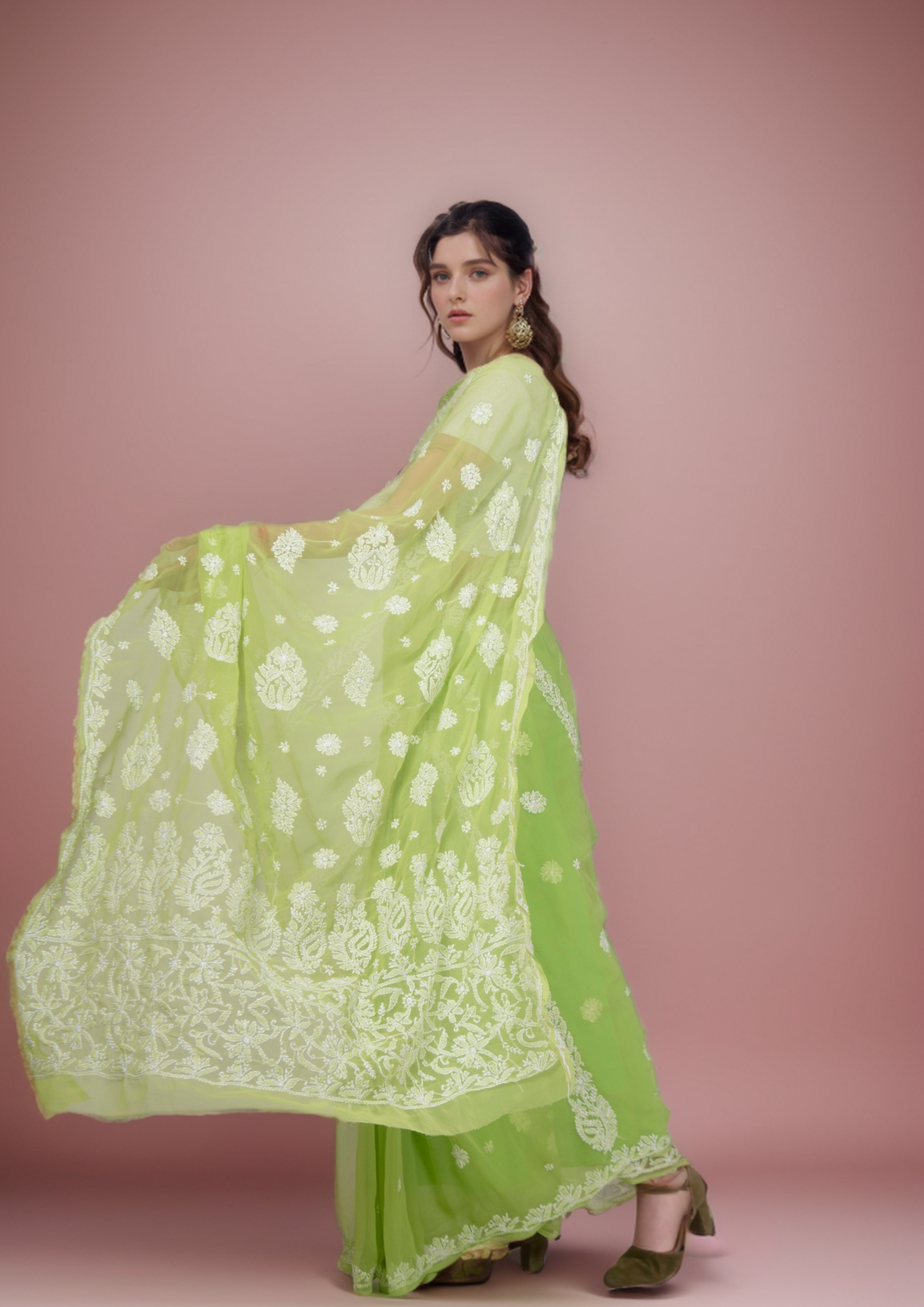 This Georgette Chikankari Saree includes an embroidered blouse, the blouse is worked up with Chikankari embroidery and the sleeves include floral motifs. This saree is definitely one of the classiest pieces created at Ivera, with such grand work and soothing color palette this saree will make you fall in its beauty.