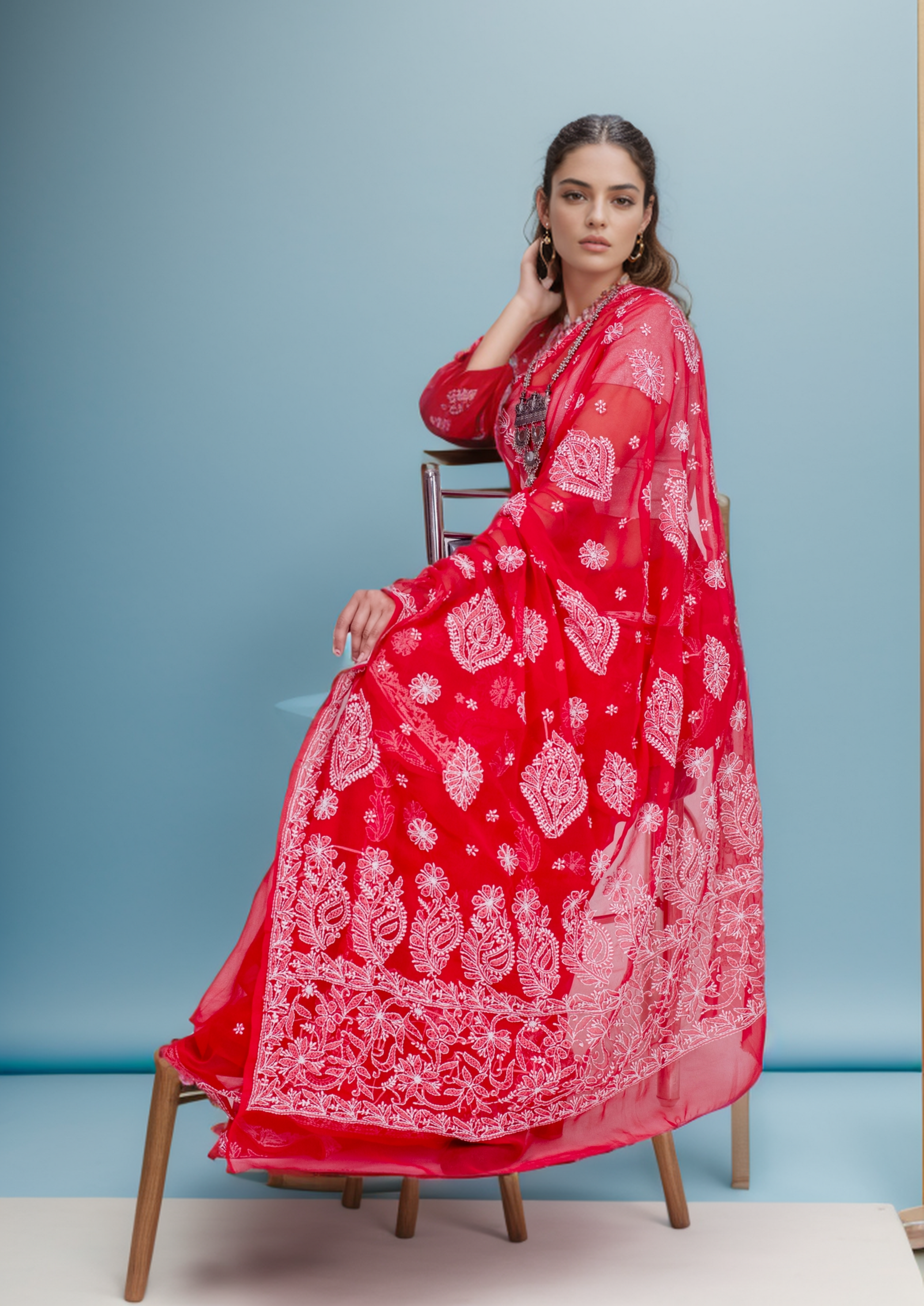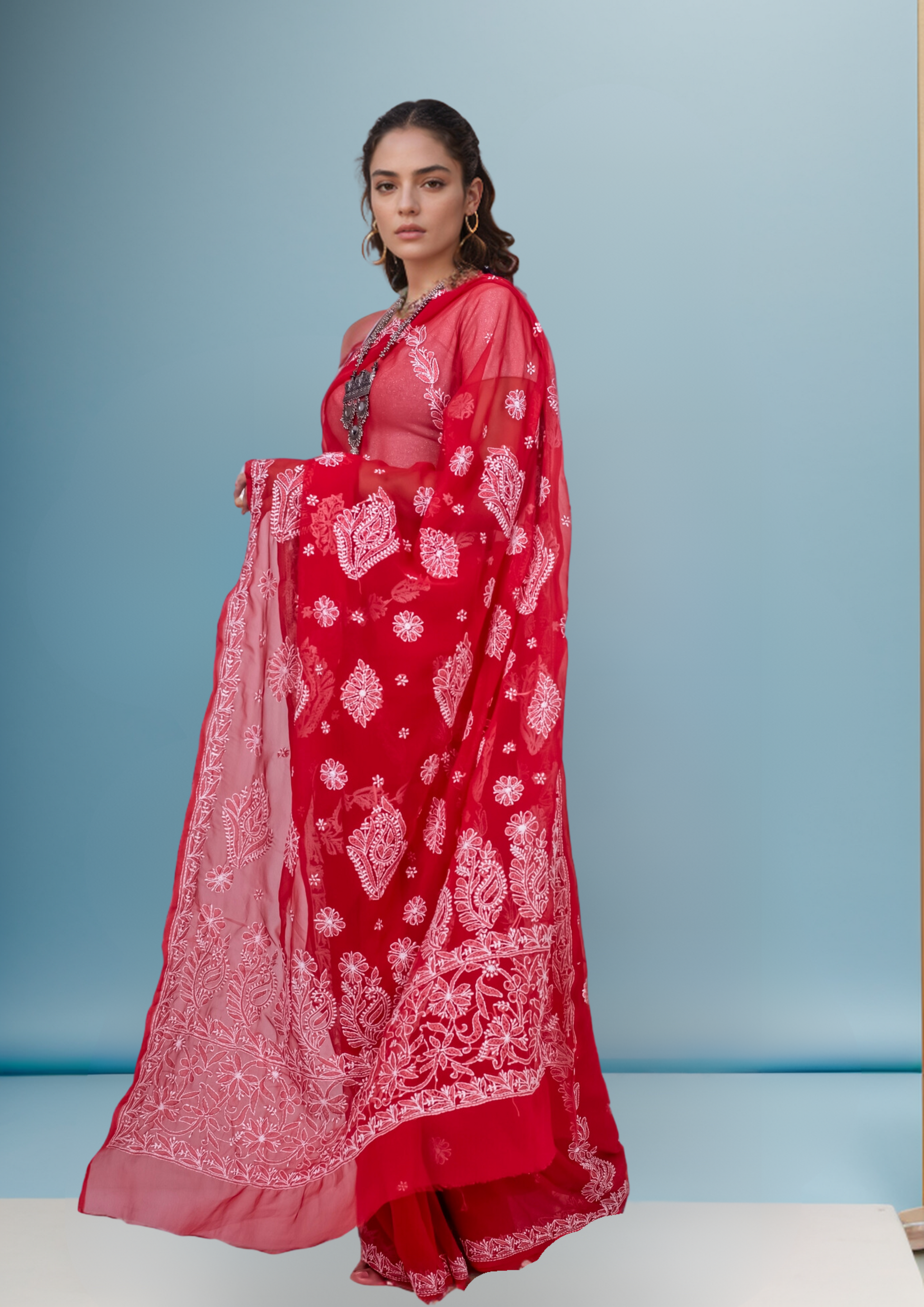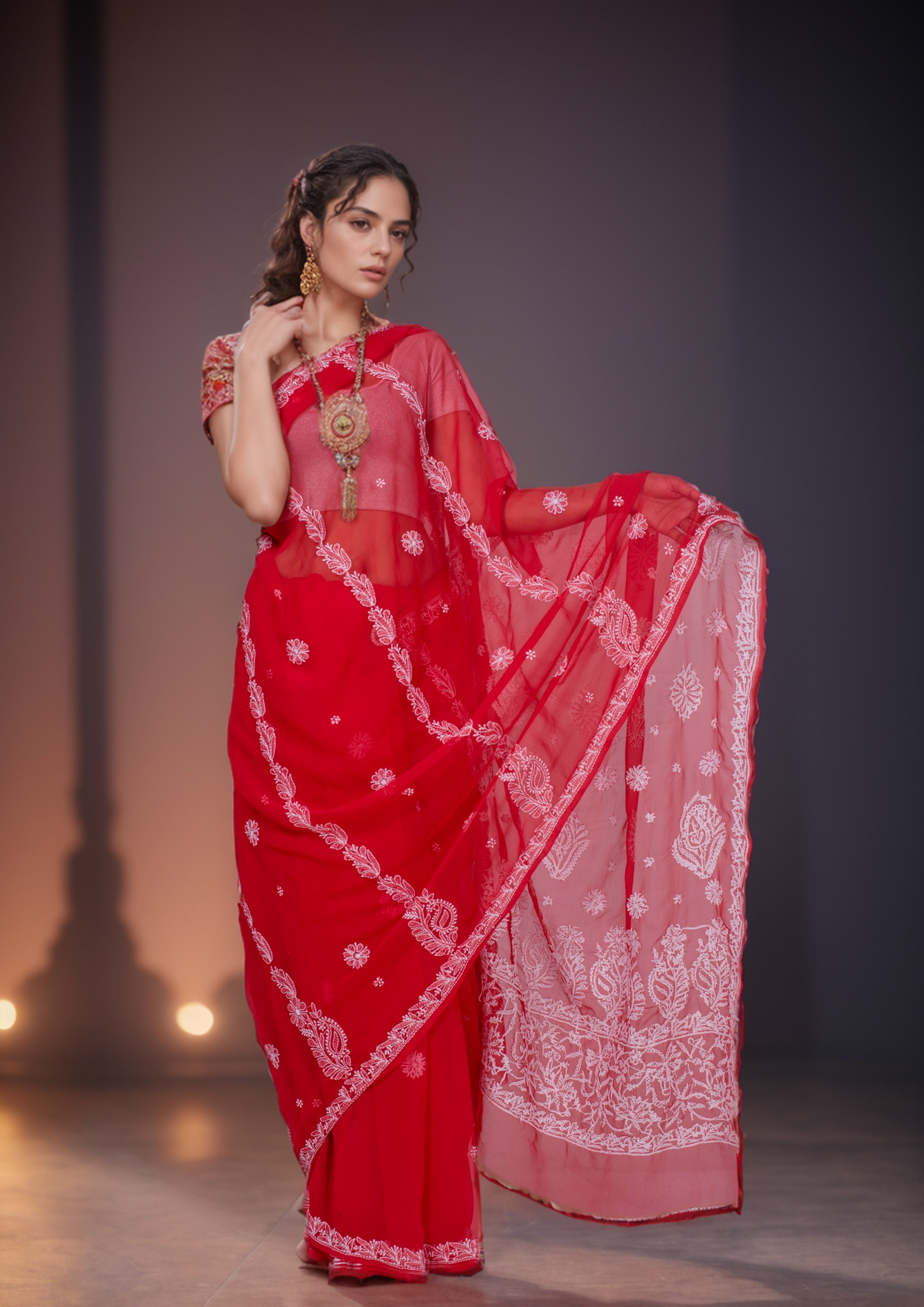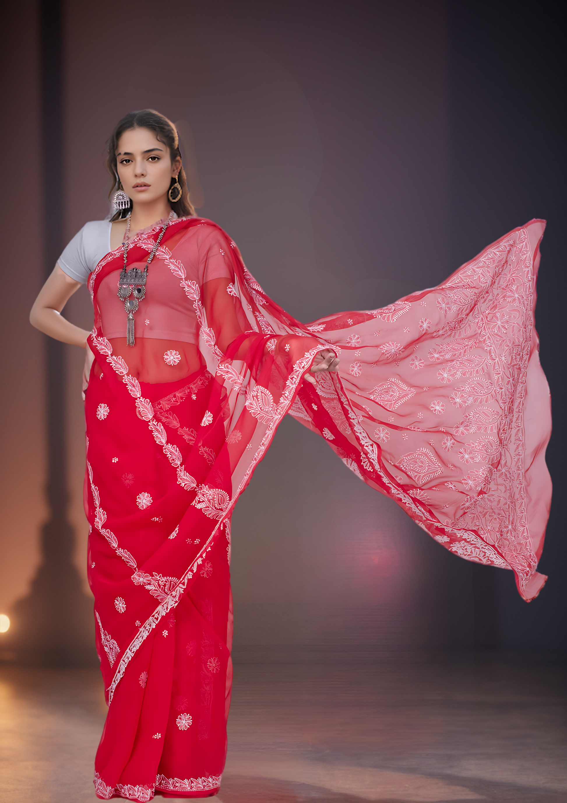 This Georgette Chikankari Saree includes an embroidered blouse, the blouse is worked up with Chikankari embroidery and the sleeves include floral motifs. This saree is definitely one of the classiest pieces created at Ivera, with such grand work and soothing color palette this saree will make you fall in its beauty.