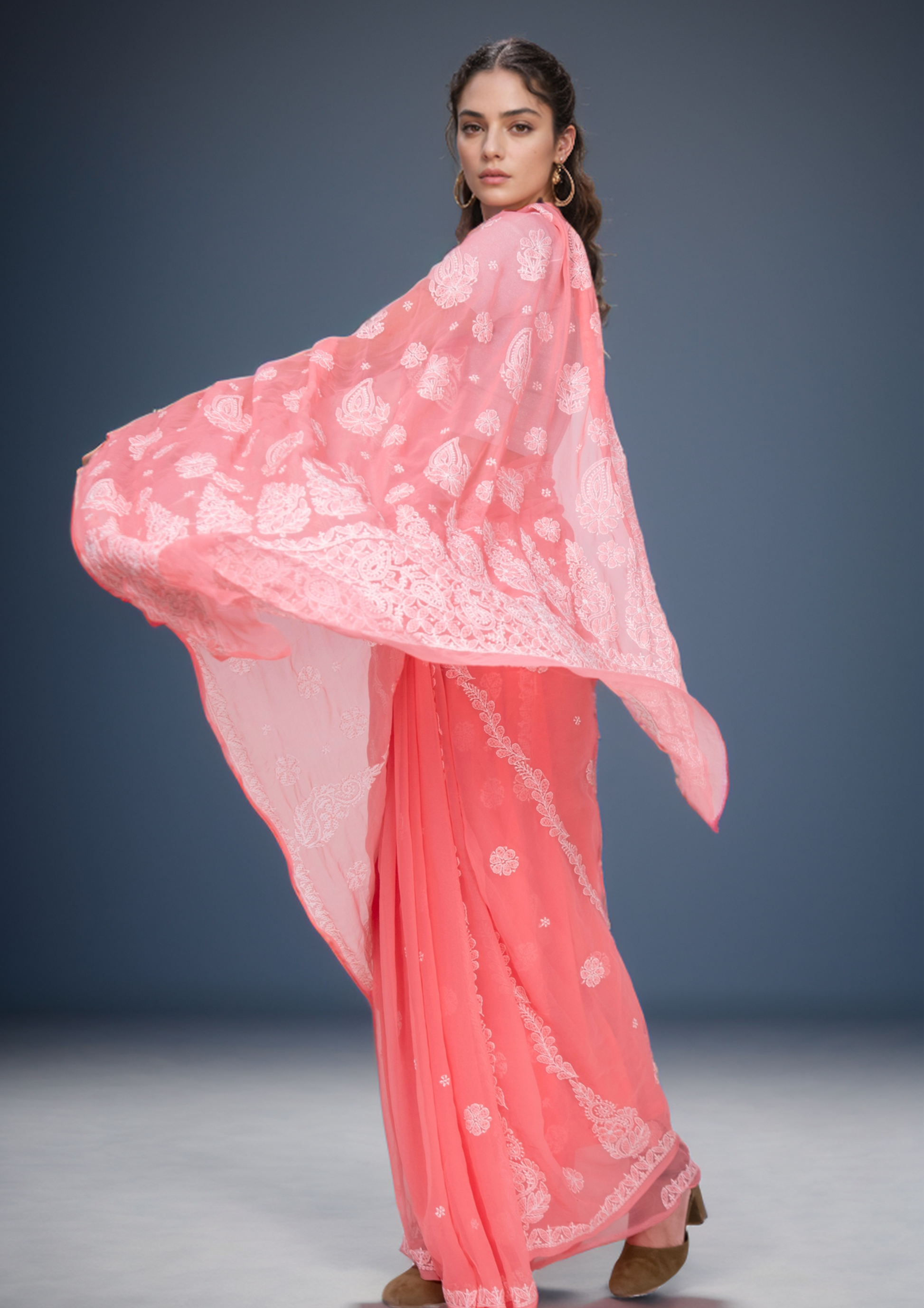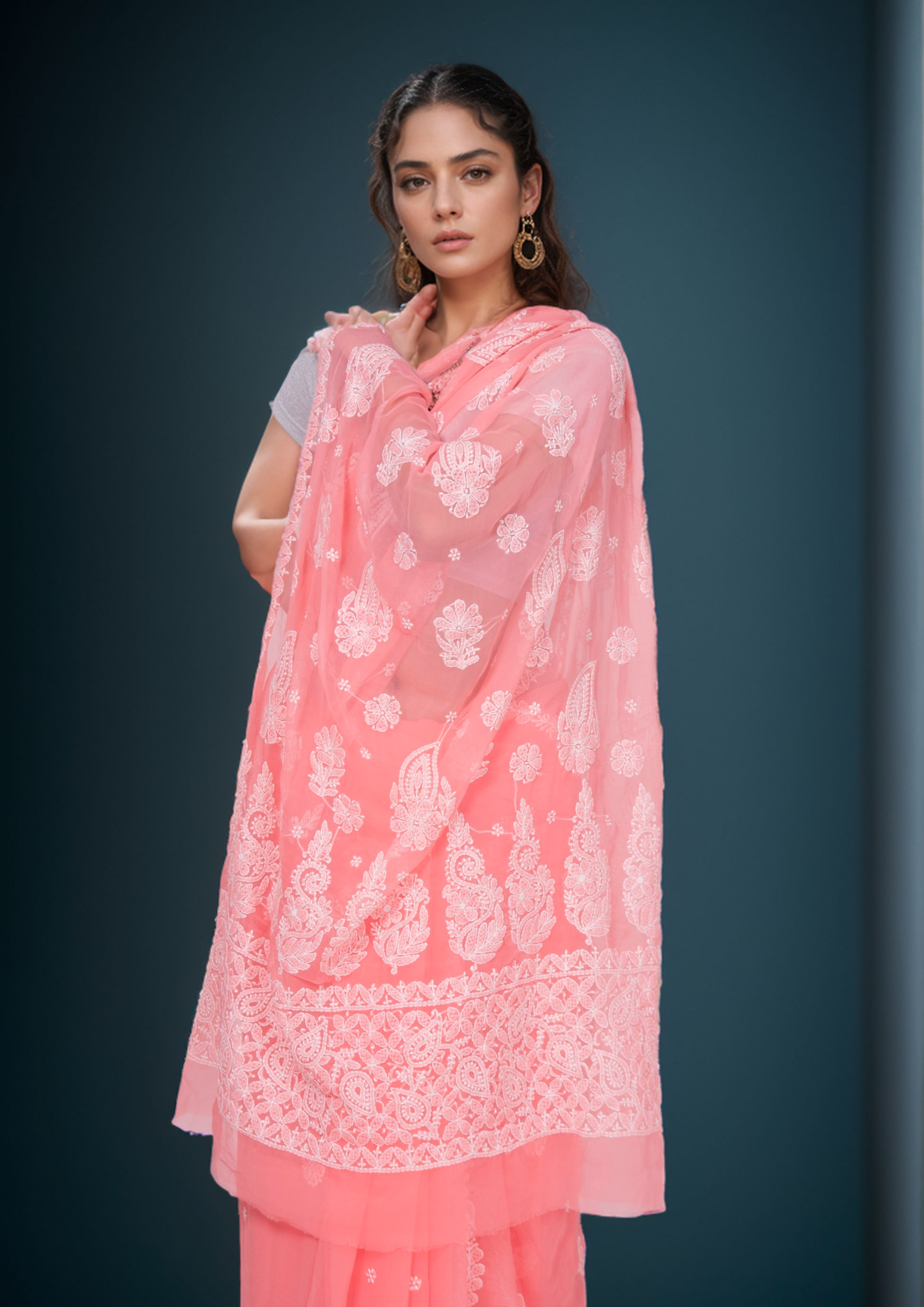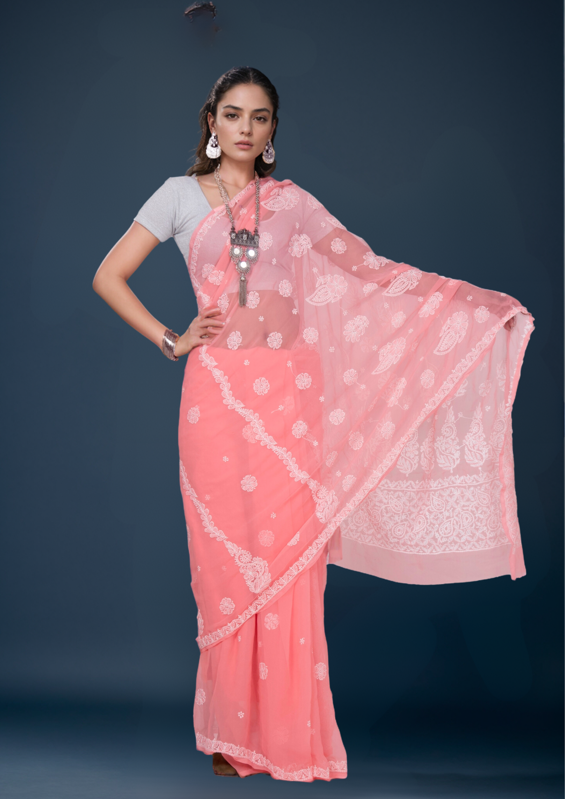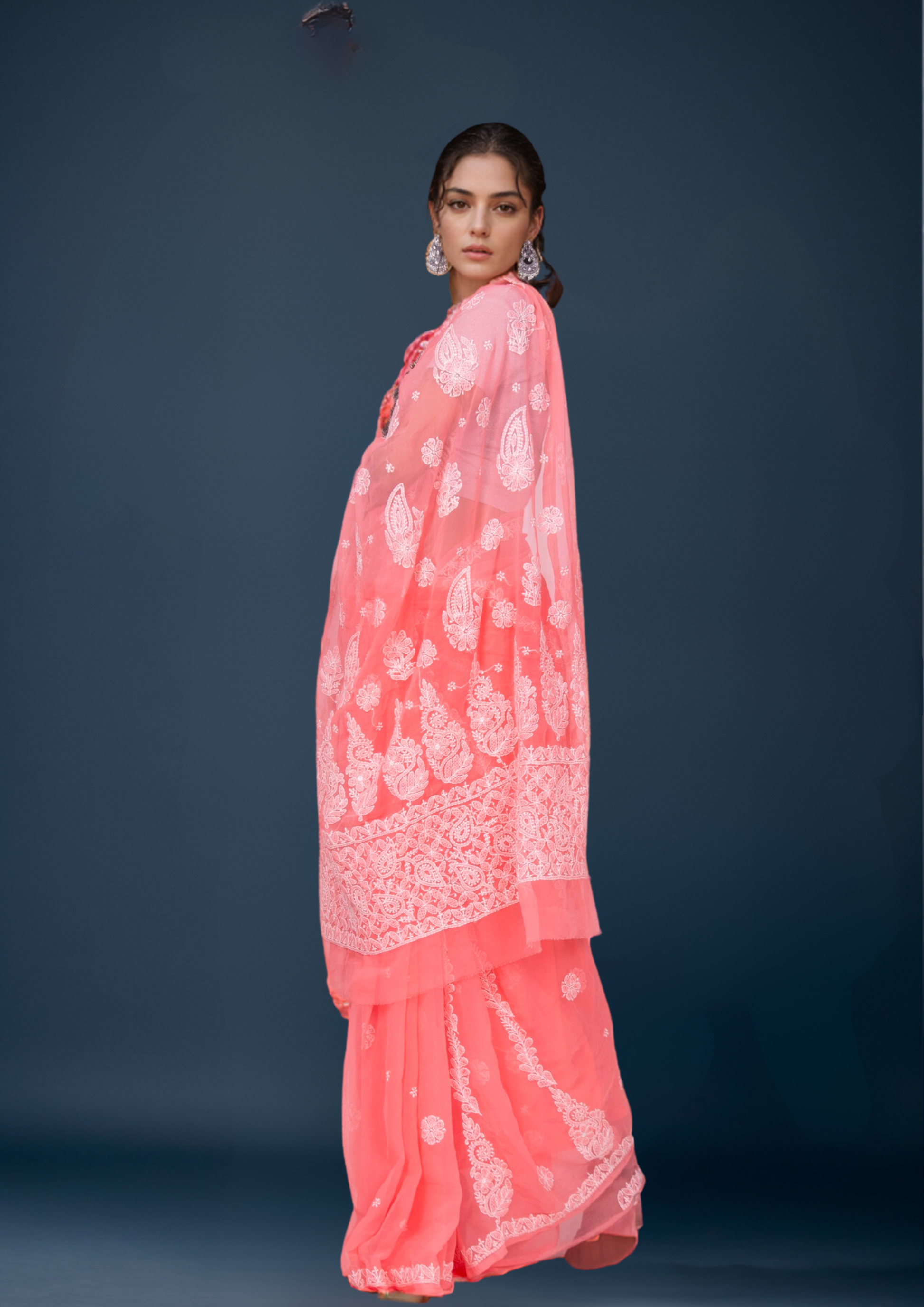 This Georgette Chikankari Saree includes an embroidered blouse, the blouse is worked up with Chikankari embroidery and the sleeves include floral motifs. This saree is definitely one of the classiest pieces created at Ivera, with such grand work and soothing color palette this saree will make you fall in its beauty.